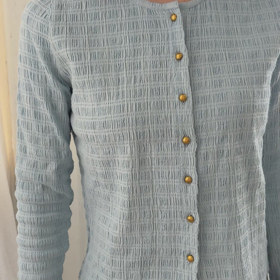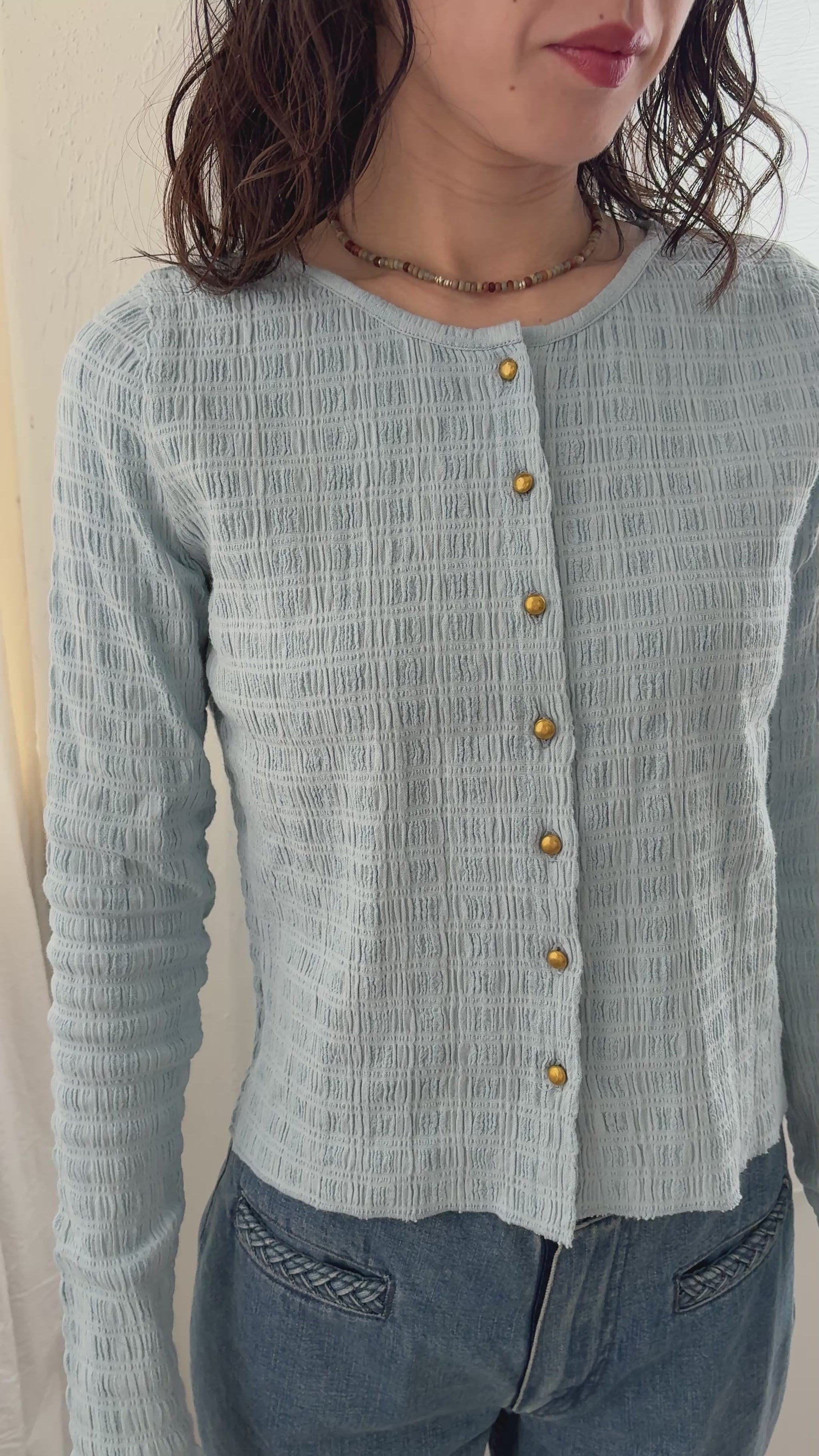 フロントに並べたゴールドボタンがポイントです。1枚お持ちいただくと、さまざまなコーディネートで活躍してくれる万能なベーシックアイテムです。