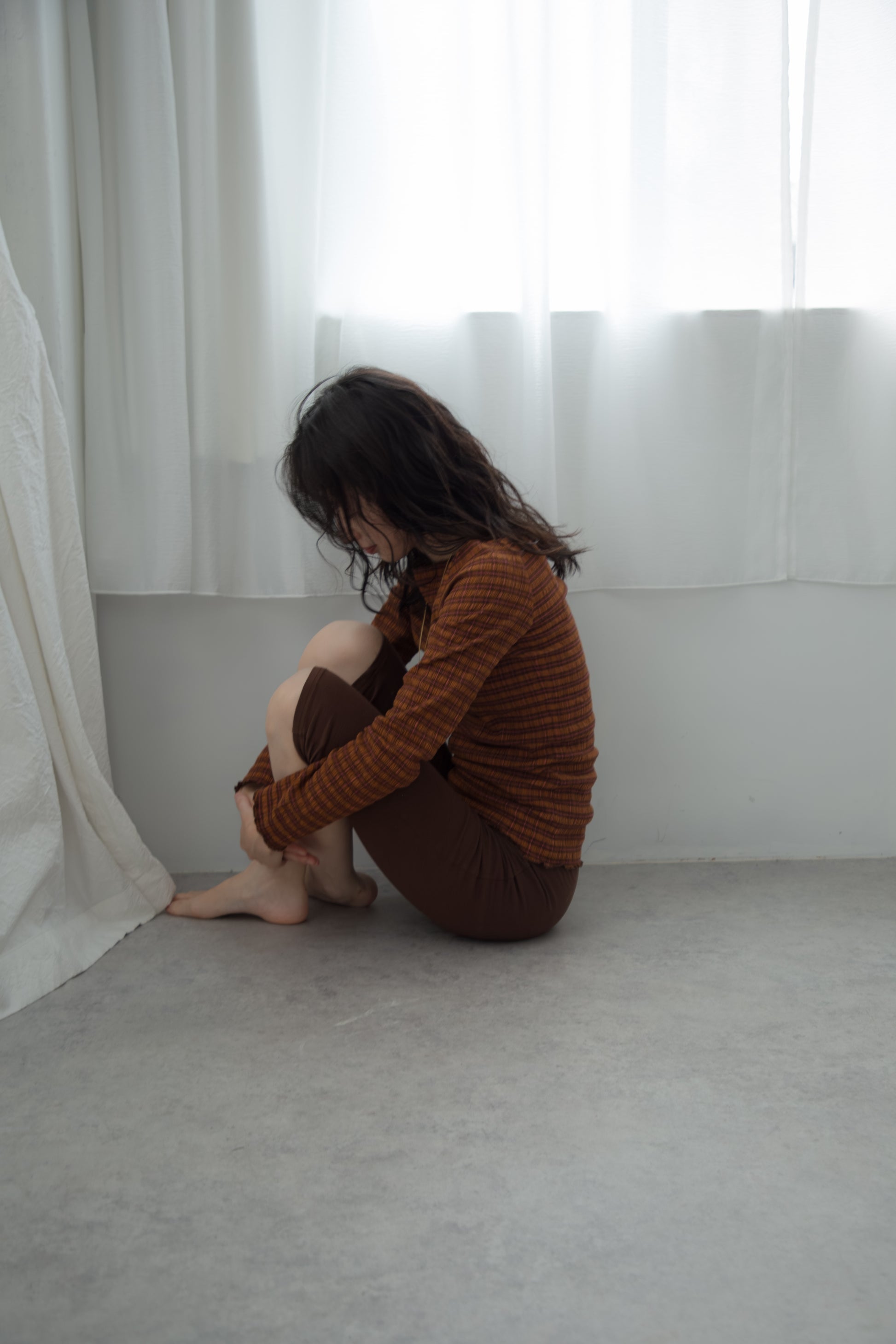 伸縮性のあるリブ素材で、軽やかにフィットしながらも締めつけ感がなく着心地の良いトップスです。