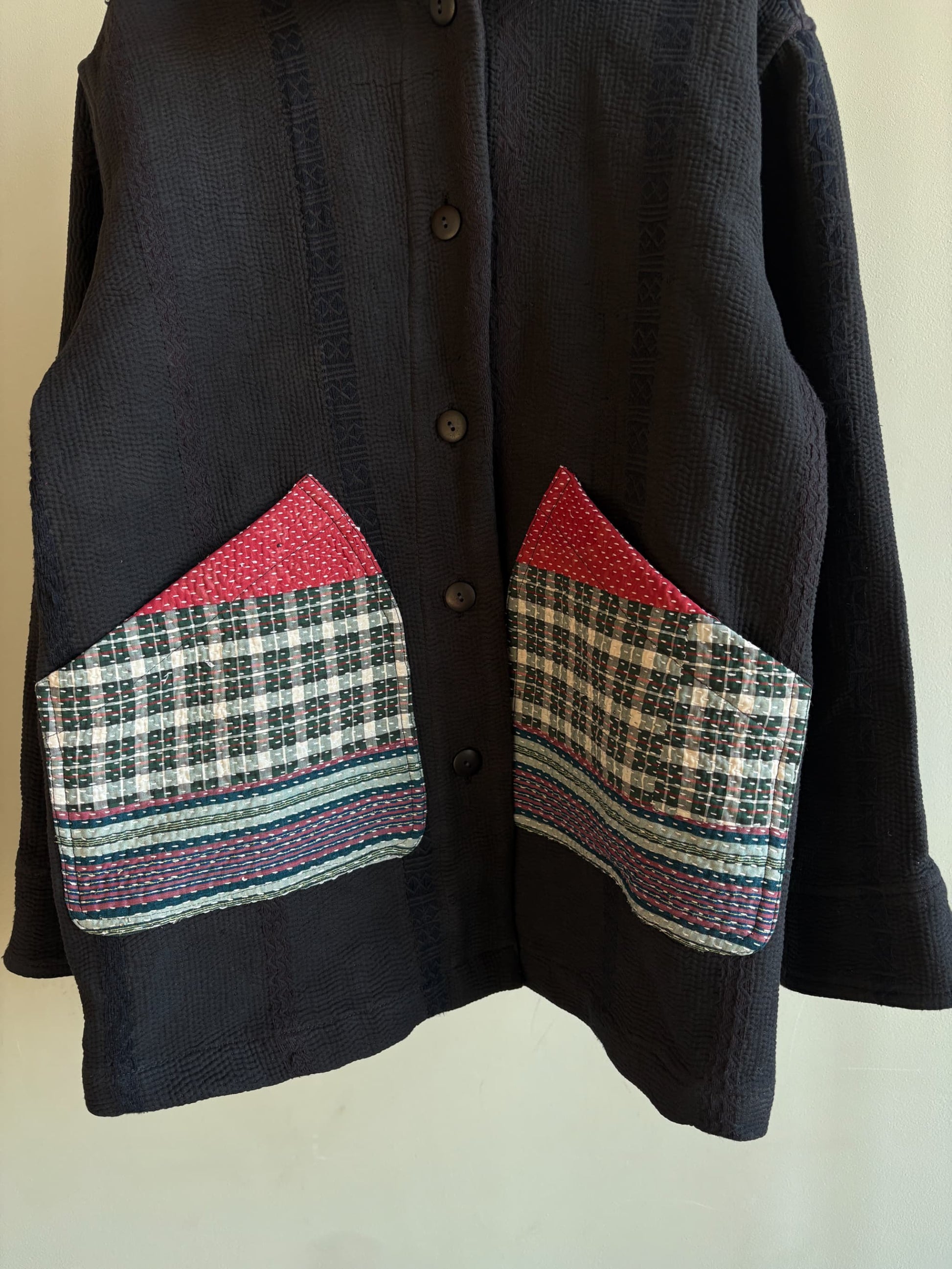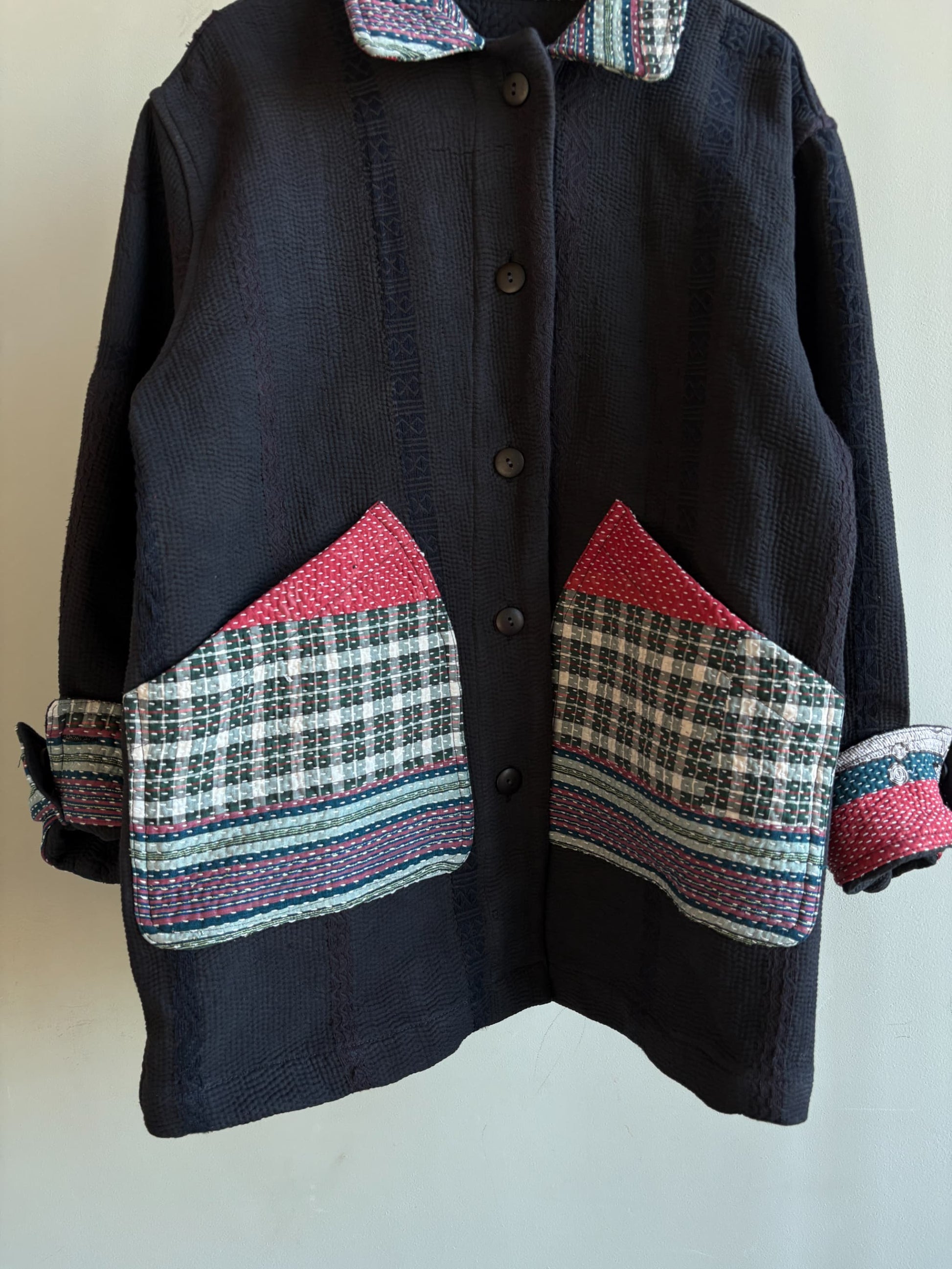 フロントやポケット、襟元には、色柄の異なるカンタを組み合わせ、