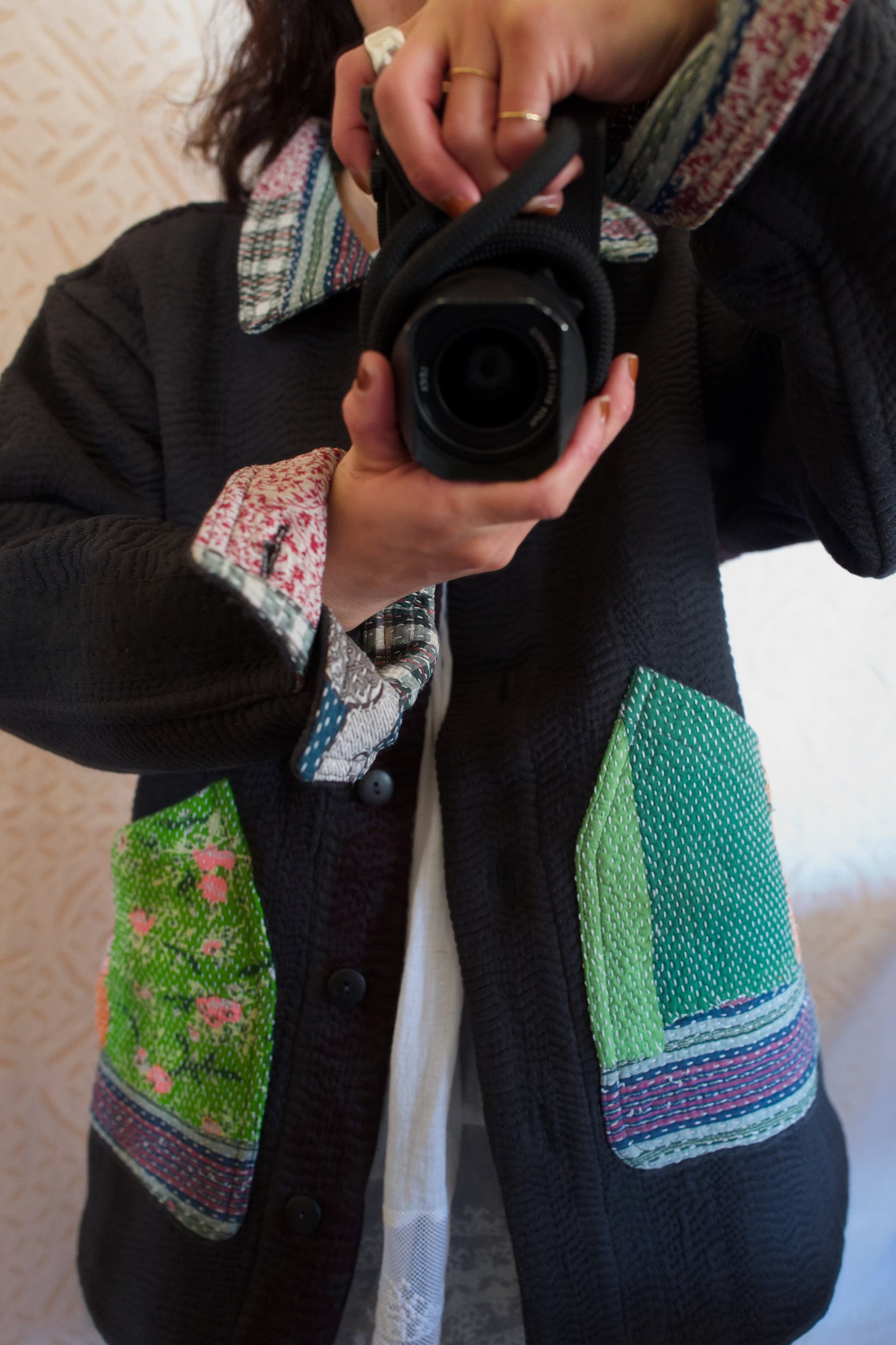 フロントやポケット、襟元には、色柄の異なるカンタを組み合わせ、